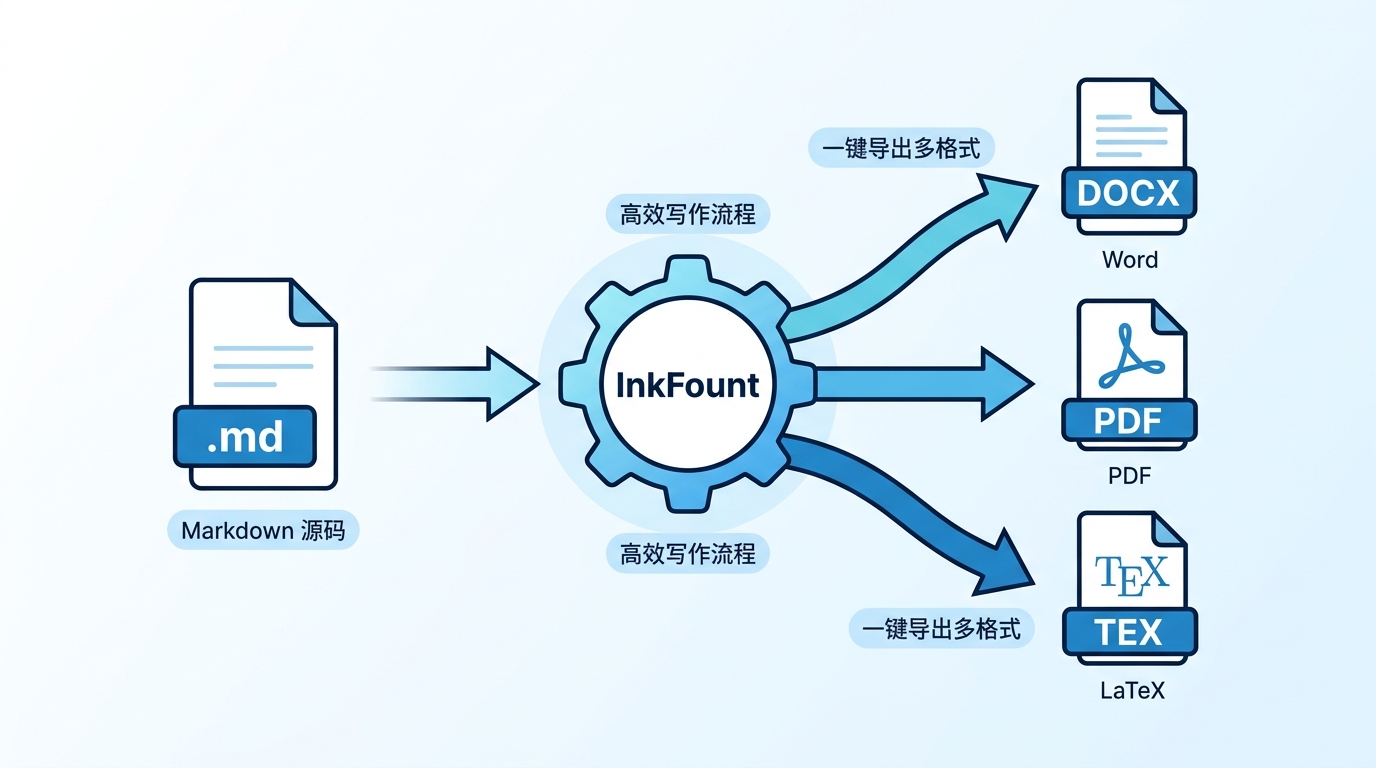 无论你的目标是 Word(用于导师修改)、PDF(用于预印本发布),还是专业的 LaTeX(用于顶刊投稿),InkFount 都能提供流畅的转换链路。更重要的是,它内置了对 GB/T 7714 等国标引用格式的支持。这意味着,当你完成内容的打磨,一键导出的即是符合学术规范的成品,无需在 Word 的格式刷和自动编号中反复折腾。