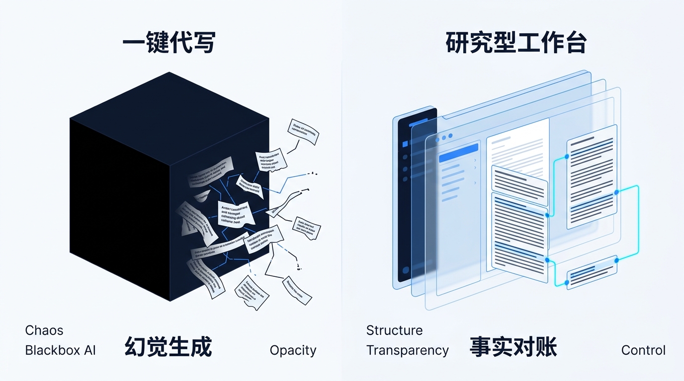 在 2026 年 AI 检测常态化的学术环境下,传统的“全自动一键代写”已沦为极具风险的产品反模式。这种模式不仅是对学术主权的让渡,更是对职业信用的透支。真正的专业写作,需要的是一个“写得可控、引得有据、改得可审”的研究型工作台。本文将深入解析,为什么在 AI 时代,我们必须从“幻觉生成”转向“专业交付”。