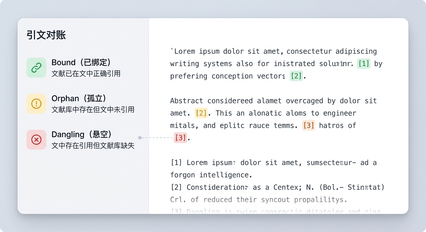 这种“引用闭环”管理,将学术严谨性从一种道德要求转化为了一项技术保障。通过三态对账,研究者可以从繁重的引文格式对照中解脱出来,专注于核心论点的构建。