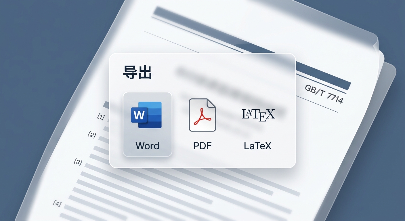 很多 AI 写作工具在输出 Markdown 纯文本后就止步了,但现实世界的专业交付物是复杂的。一个博士生需要符合 GB/T 7714-2015 国标的引文格式;一个咨询顾问需要提交一份排版精美的 Word 给客户;一个物理学家则可能需要完美的 LaTeX 源码。