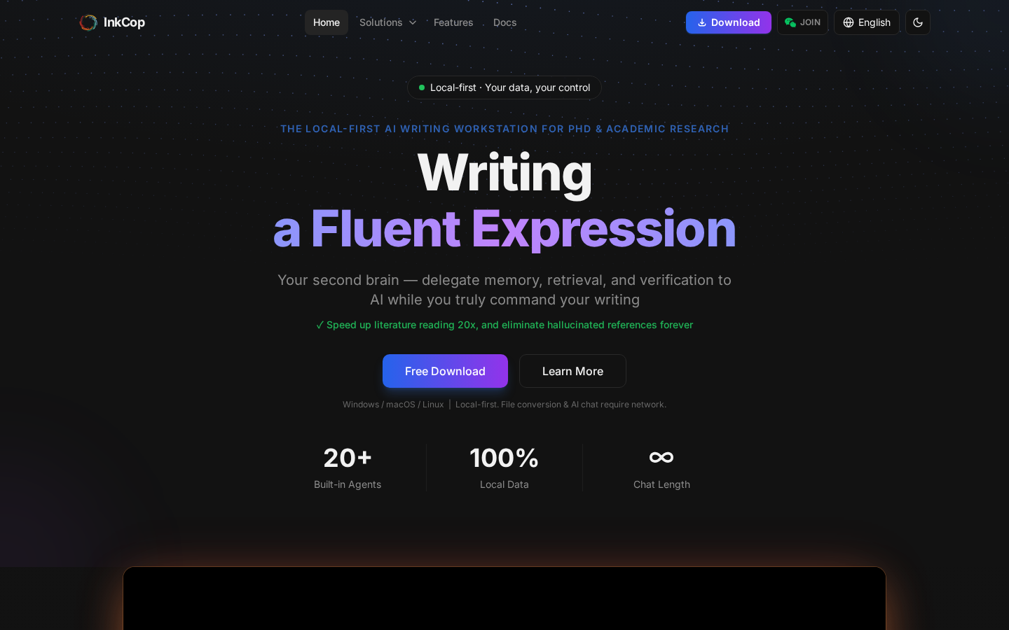 针对上述痛点,2026 年的研究者开始转向更专业的学术 Markdown 编辑器——InkFount。它不是单纯的模型聚合,而是将 AI 能力深度集成在“稿纸端”的生产力工具。