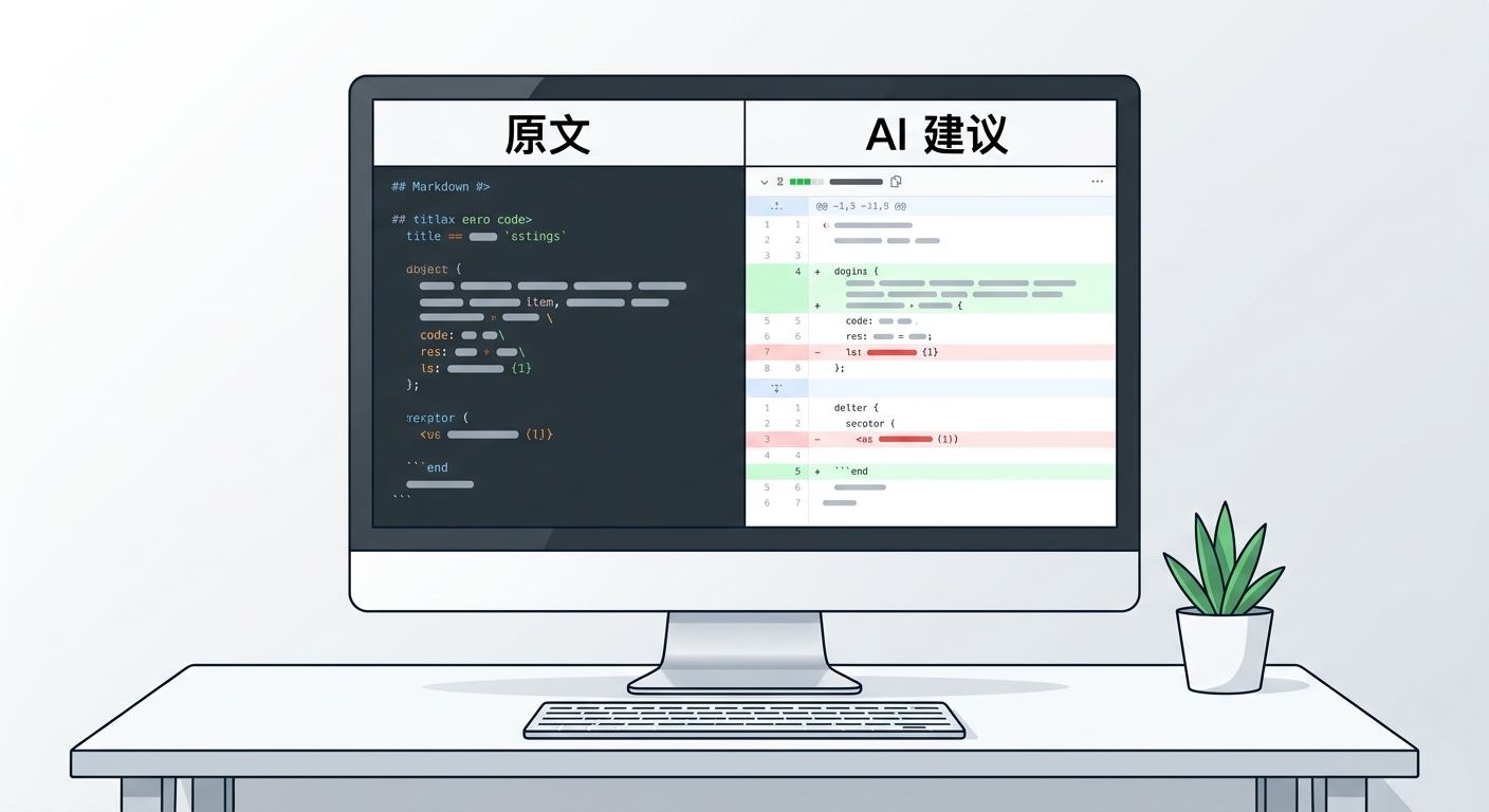 在 InkFount 中,AI 对文本的修改被称为 Patch(补丁)。这类似于软件工程中的代码审查(Code Review),而非简单的覆盖重写。