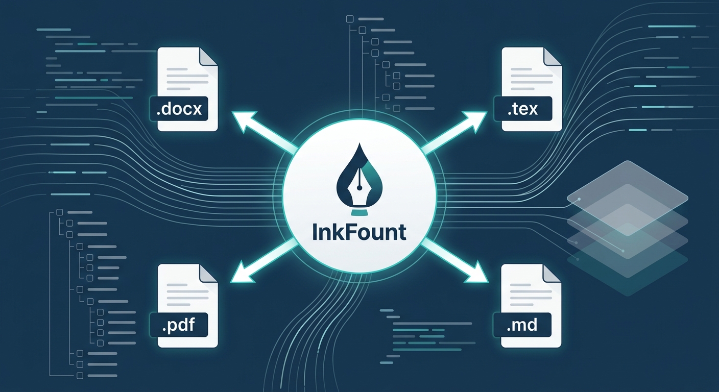 无论你的目标是提交给导师的 Word 文档,还是需要提交给顶刊的 LaTeX 源码,亦或是直接打印成 PDF 白皮书,InkFount 都能实现无损转换。你不再需要担心在不同工具间迁移导致的公式乱码或缩进失效问题。