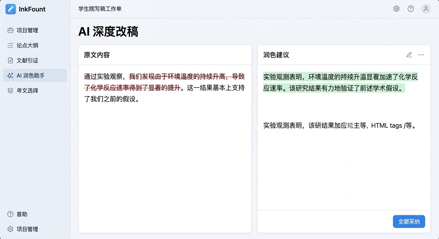 通用的润色工具常因追求“文采”而改变了严谨的学术定义。在 InkFount 的工作台环境下,AI 能够通过对全文 Markdown 结构的感知,更好地理解学术语境,避免将专有名词误改成通用词汇。