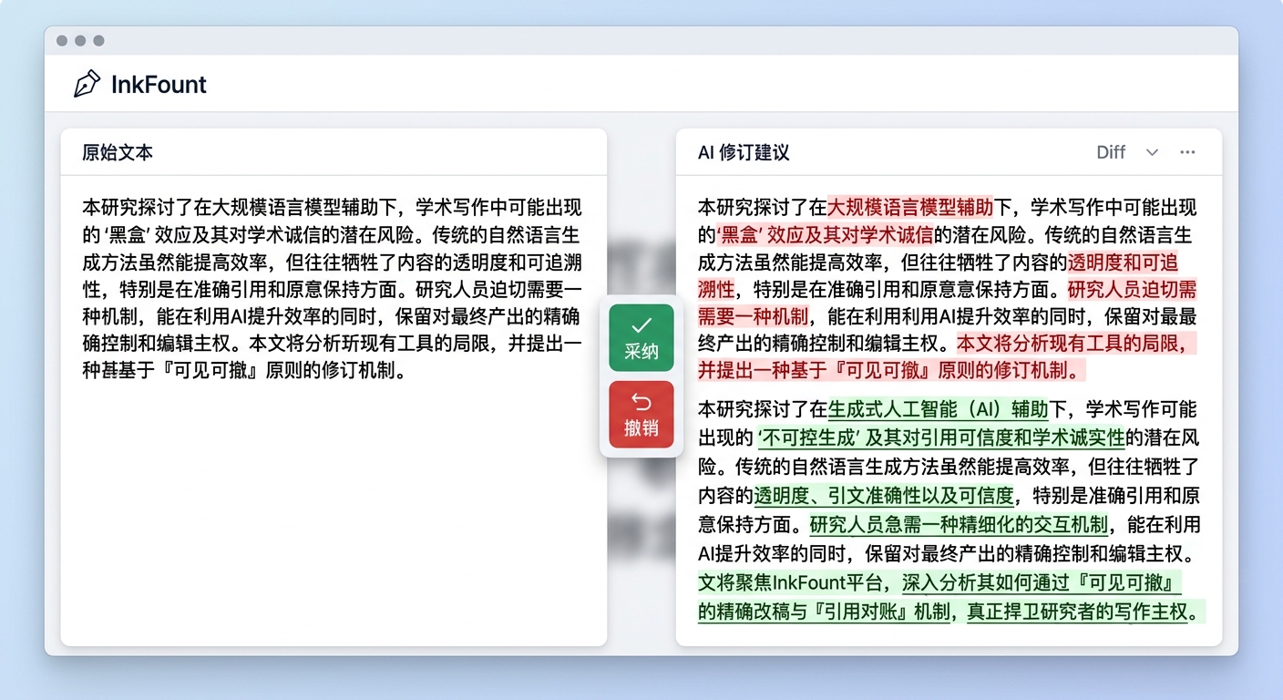 研究型写作不应为了效率而牺牲“确定性”。真正的 AI 协作不该是黑盒替换,而应该是可见、可撤、可审计的精密手术。InkFount 的出现,正是在尝试通过“精确 Patch(补丁)”范式与“三态引用对账”机制,将写作主权从不可控的算法手中夺回,交还给研究者本身。