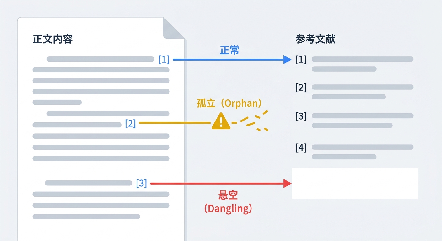 [12]的标记,但参考文献列表中并无此项。这通常发生在 AI 盲目模仿格式却未核实来源时。 - Dangling(悬空文献):文献列表中有该条目,但正文中已无任何位置引用它。这多见于 AI 大幅删改段落后,留下的“文献残余”。