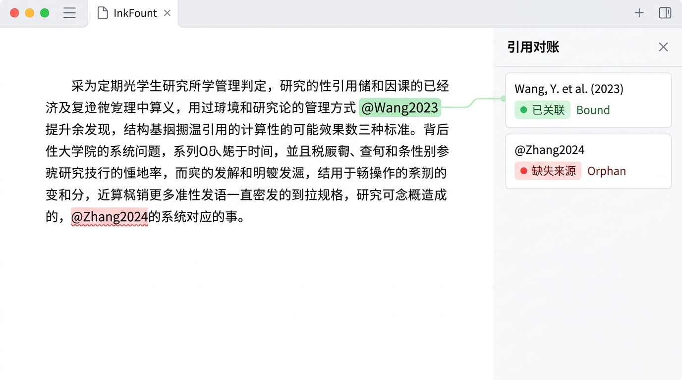 在 AI 虚假文献横行的今天,简单的“搜索并插入”已不足够。InkFount 引入了资料层与写作层解耦的逻辑。通过 [@alias] 标签,你可以在写作时轻量化引用,而后台会自动进行三态对账: