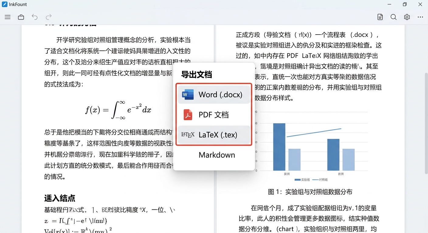 - 全格式导出:支持一键导出符合排版要求的 Word、PDF 或 LaTeX 源码。无论是需要导师审阅的 Word 稿,还是期刊要求的 LaTeX 终稿,都能无缝切换。