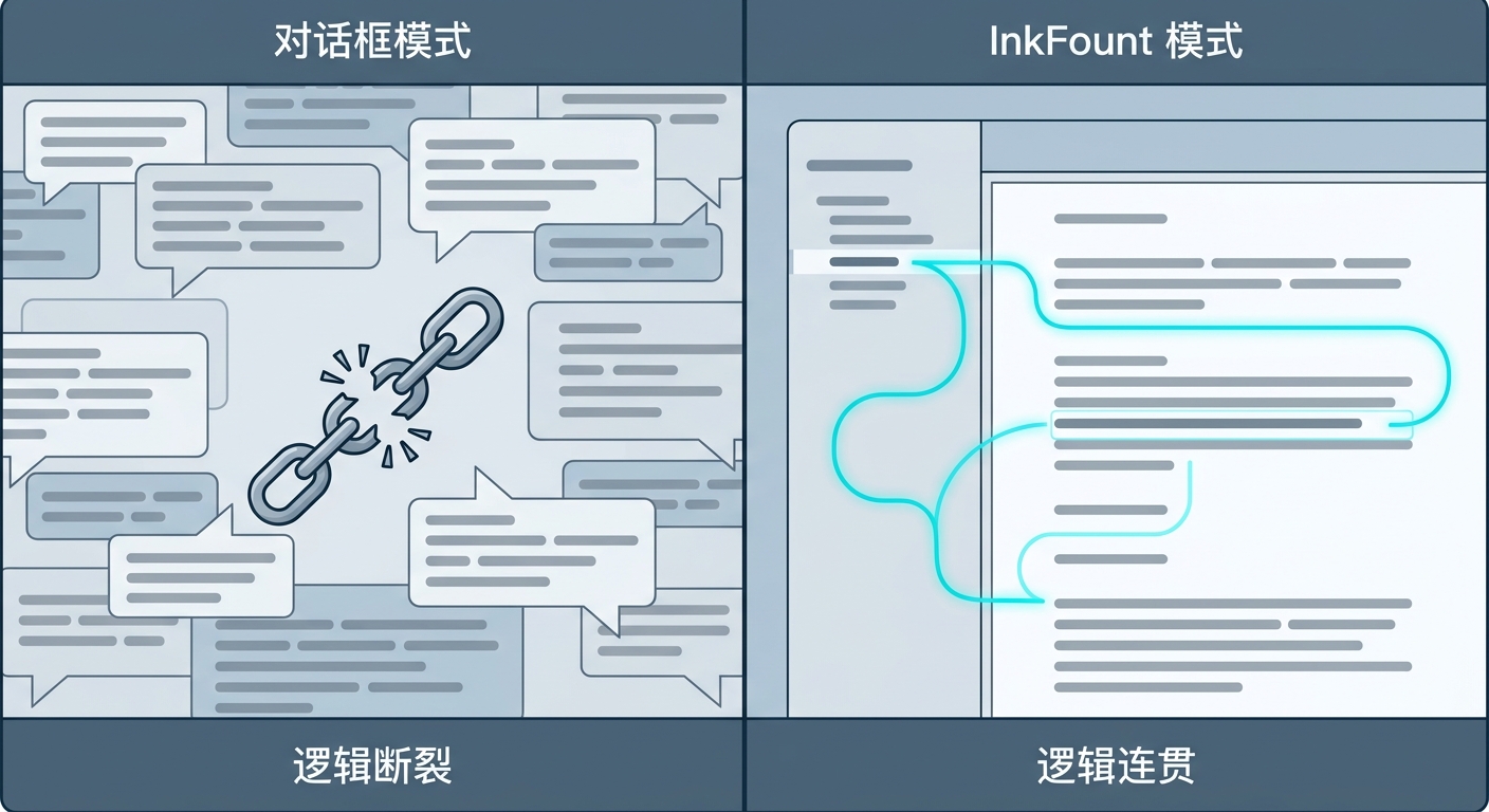 解析 ChatGPT 处理长文档时逻辑断裂与引用错乱的技术根源。探讨 InkFount 如何通过稿件现场改稿与引用对账系统,为研究员与博士生提供具备全局感知的专业写作方案。